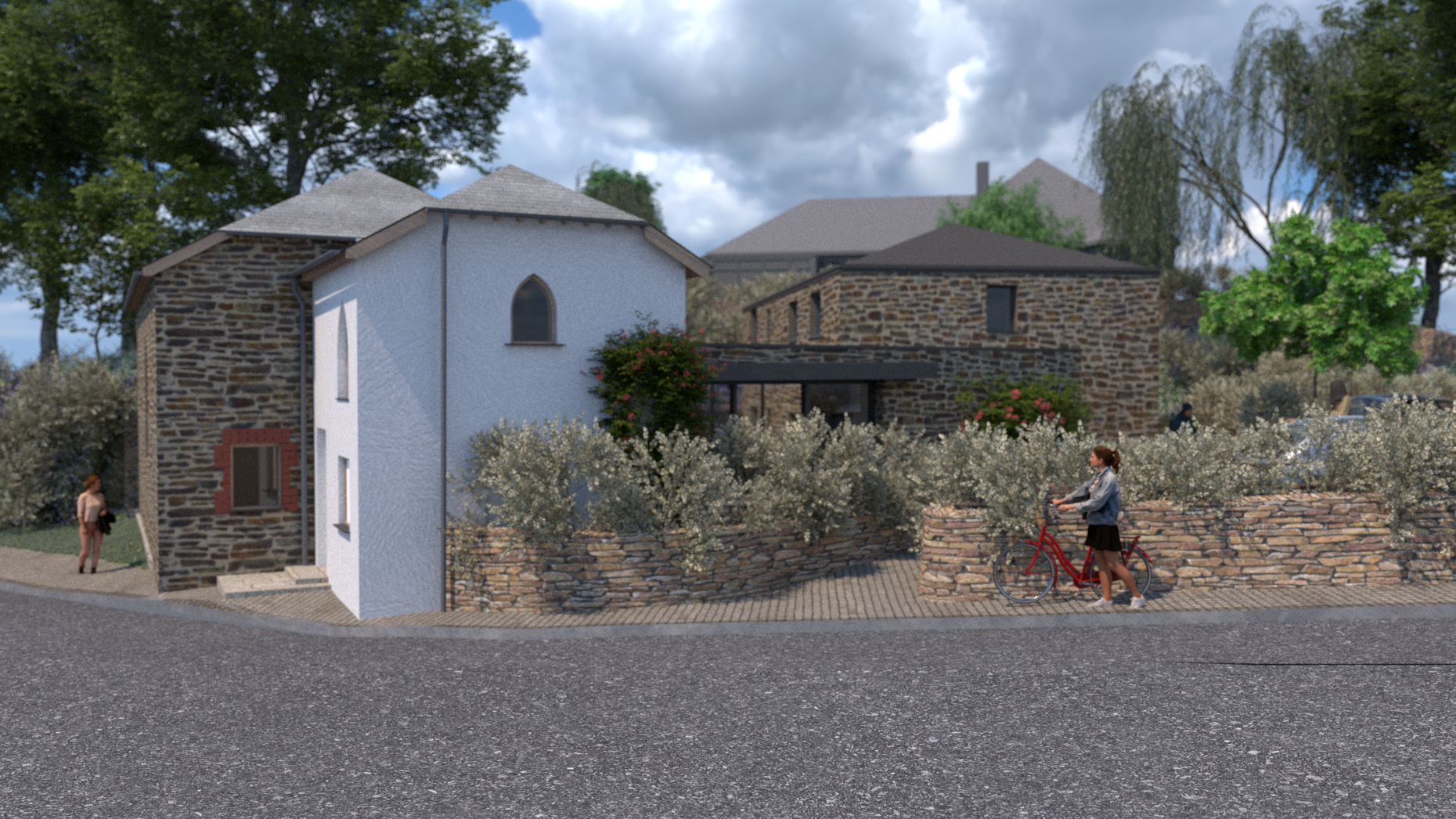 The proposal reinstates the chapel’s original western elevation and replaces a roadside wall with setback Cornish hedging to soften the boundary and enhance pedestrian safety. A new two-storey wing is rotated and recessed to preserve the chapel’s historic prominence. It connects via a glazed link that frames a sheltered courtyard at the centre of the spatial layout.